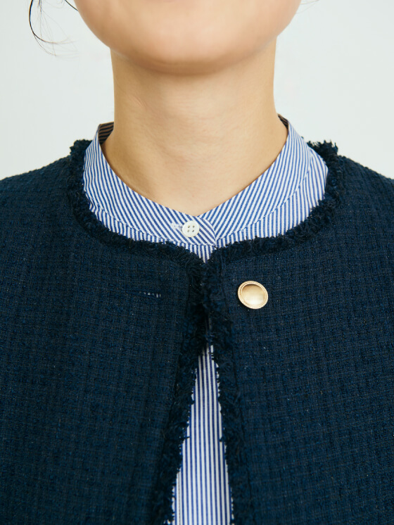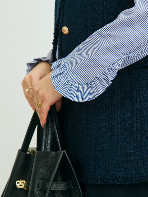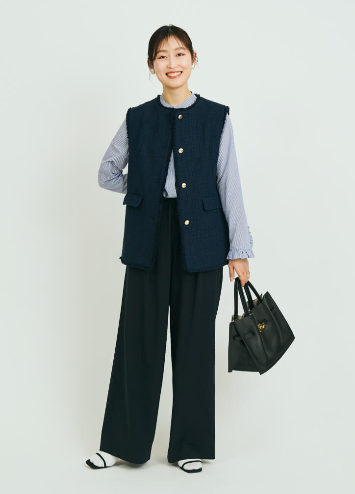 フォーマル感の強いツイード素材は、ストライプのフリルシャツをインに重ね、足元はミュールにソックスを合わせるなど、あえて外しをプラス。王道のきれいめスタイルに寄せすぎず、軽さを出すレイヤードで、ツイード特有の重さを和らげました。クリーンさを保ちながらも、肩の力を抜いたバランスがこのスタイルのポイントです。