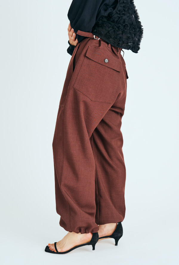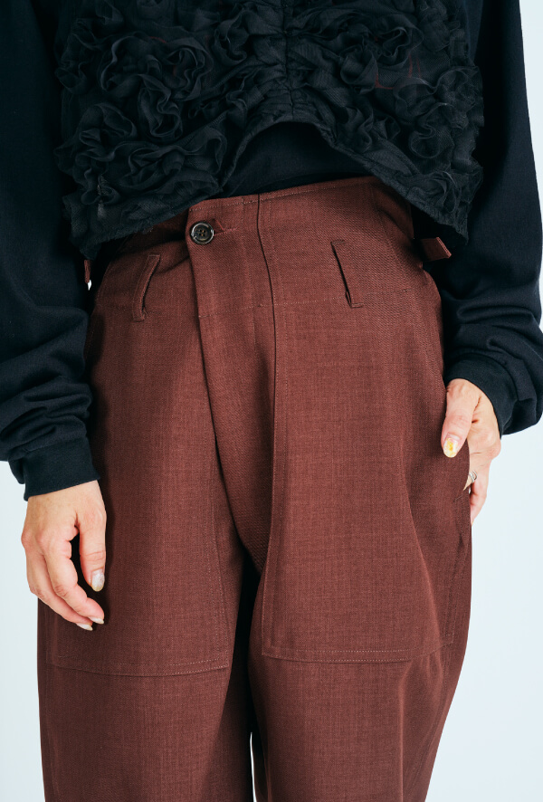 アレンジしたベイカーパンツは、ラップ風のフロント