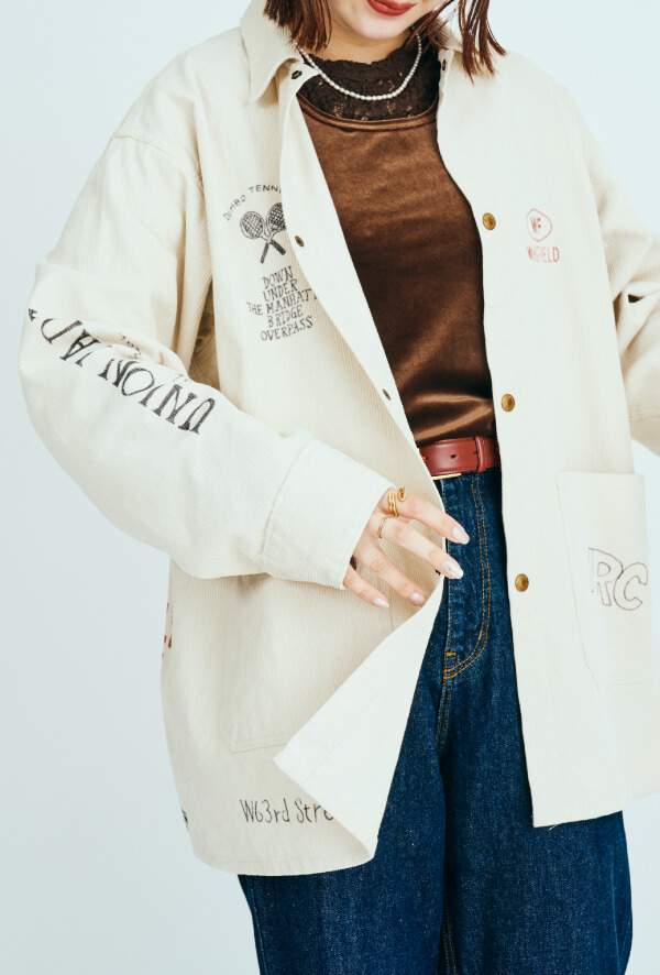 全体に配した総柄プリントは、SHIPS 50周年のミューズ、女優ダイアン・キートンの代表作『アニー・ホール』から着想したフレーズとイラストを散りばめた特別なもの。物語をまとうように着こなしを楽しめるメモリアルピースです。