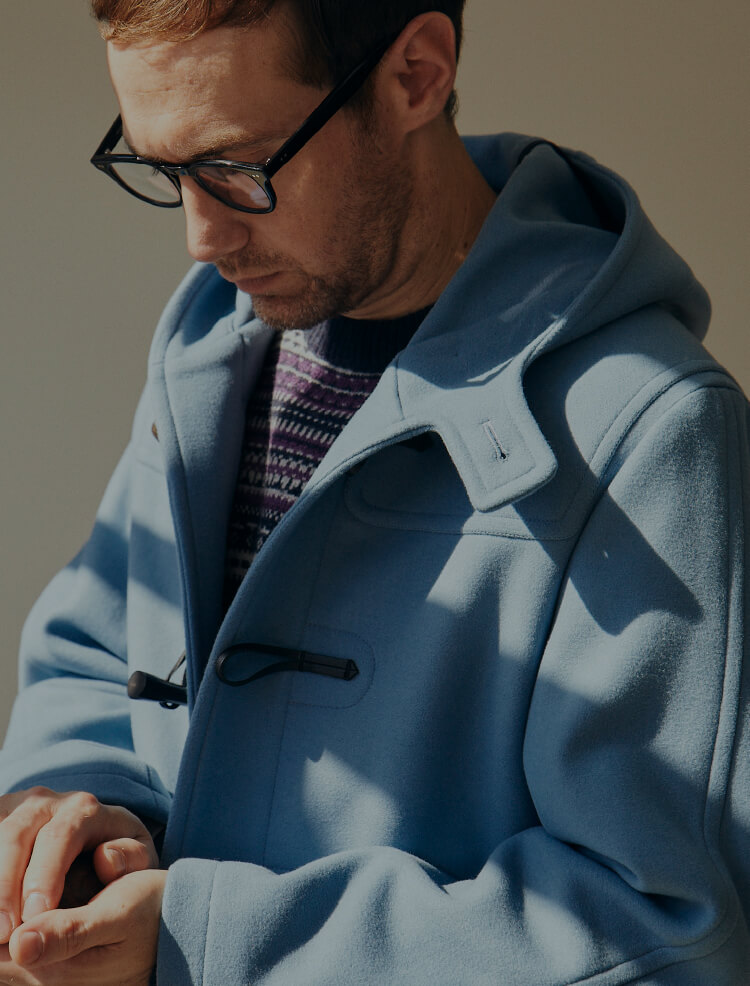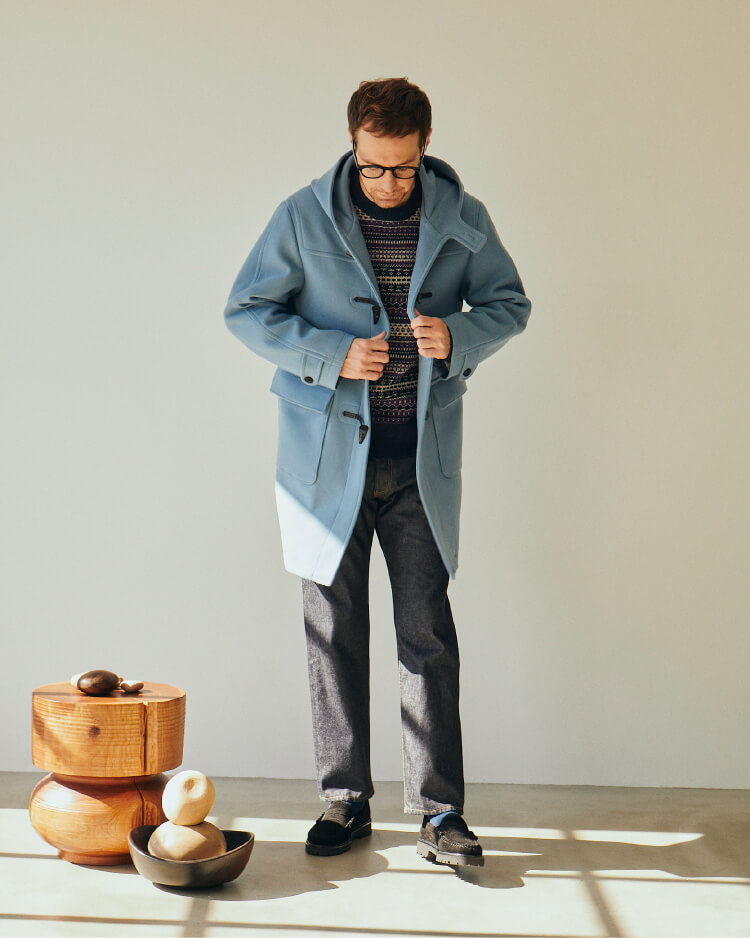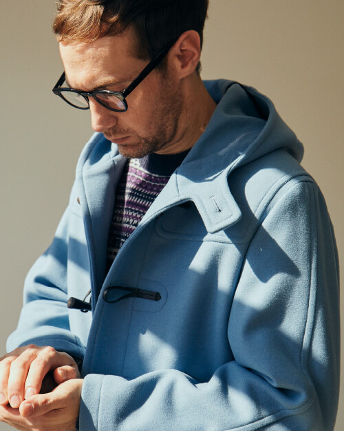 ダッフルといえば頑丈で肉厚のイメージですが、生地の高級感をプライオリティに掲げた渾身のオリジナルがこちら。繊細なスーパー140’Sのウールは着心地も軽やか。さっと羽織るように着てもドレッシーで、ジーンズでもスラックスでもきちんと感を表現できます。柔らかなフード周りも、愛すべきディテールワーク。