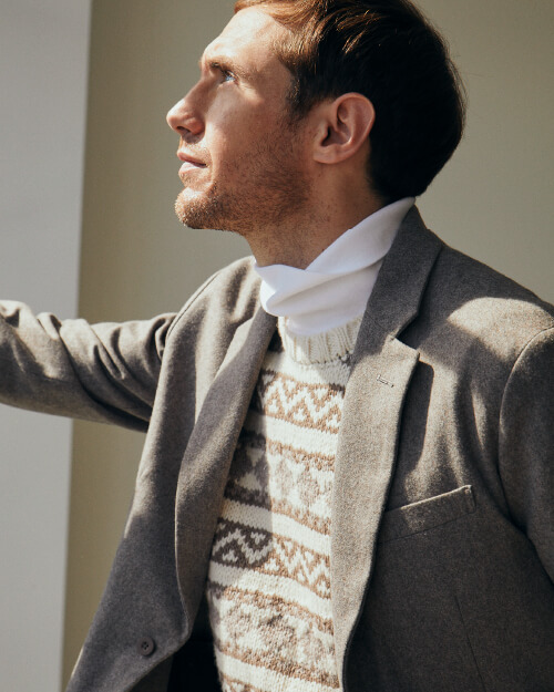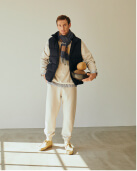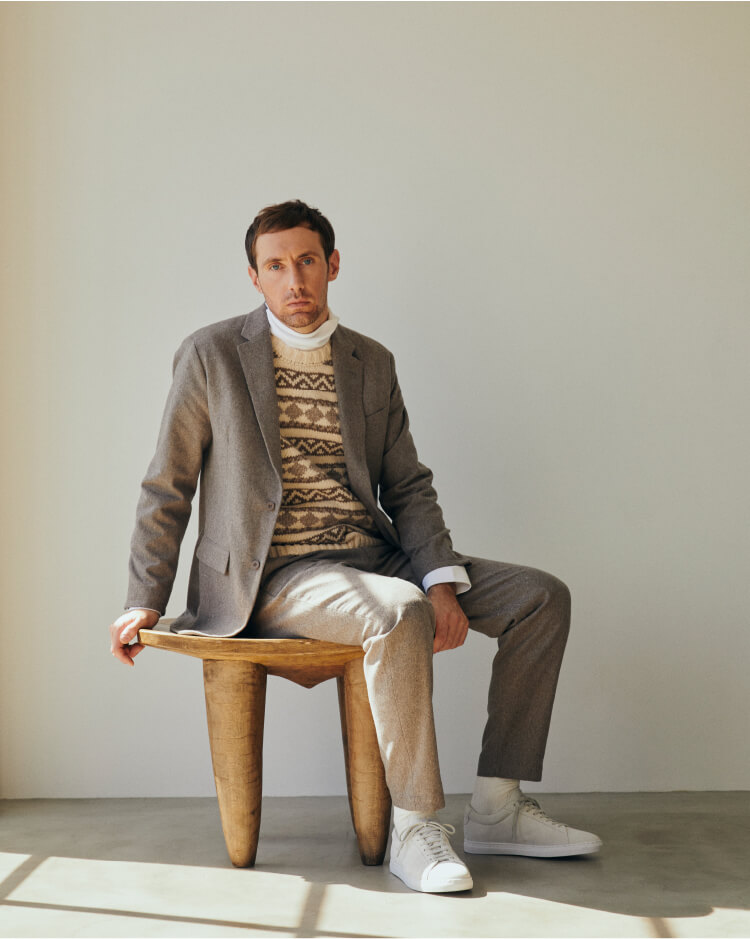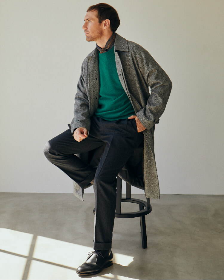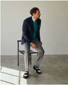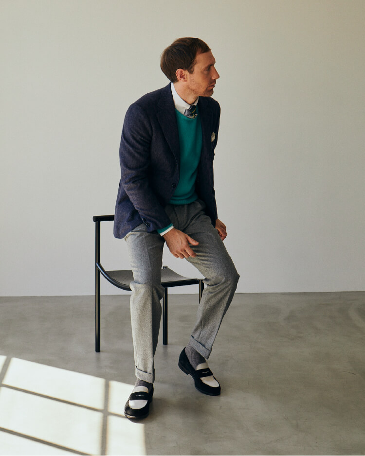 見た目の温かさと心地よさを両立させたセットアップは、程よい抜け感がポイント。スーパー140’Sの繊細なウールに、7種の快適な機能を持ったソロテックスを混紡したフラノ地は品の極み。カットソーやソックス、スニーカーはあえての白でカジュアルに。ジャケパンはそれぞれ単体で着用することができます。