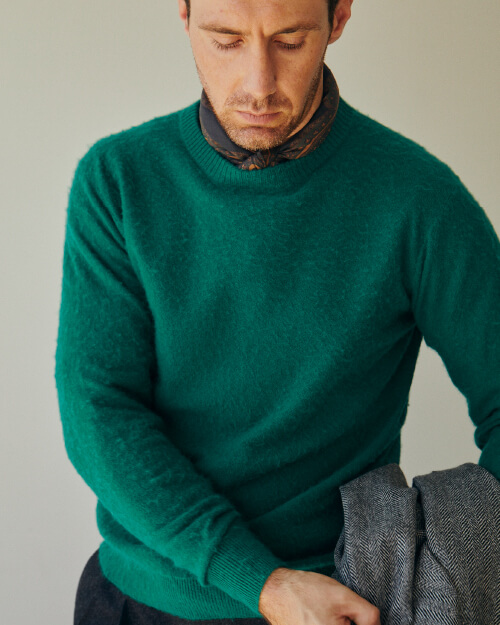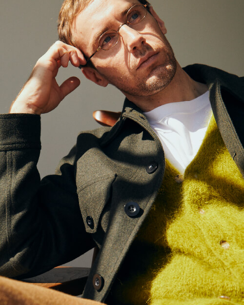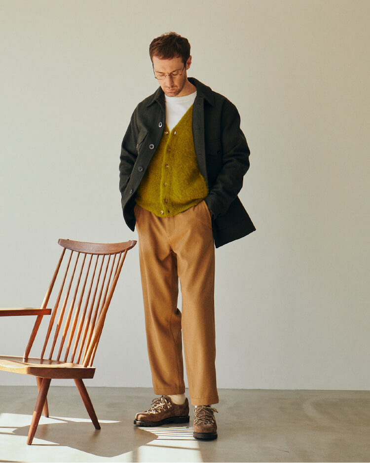 毎年更新したいニット、今年はざっくりとはおれるカーディガンがおすすめ。そしてカジュアルな雰囲気を高める毛足の長いアルパカがムードです。Tシャツやカットソーにラフに合わせるのが正解。アースカラーで全体を統一しつつ、オリーブが絶妙なアクセントに。足元やアウターにアウトドアなテイストを取り入れて。