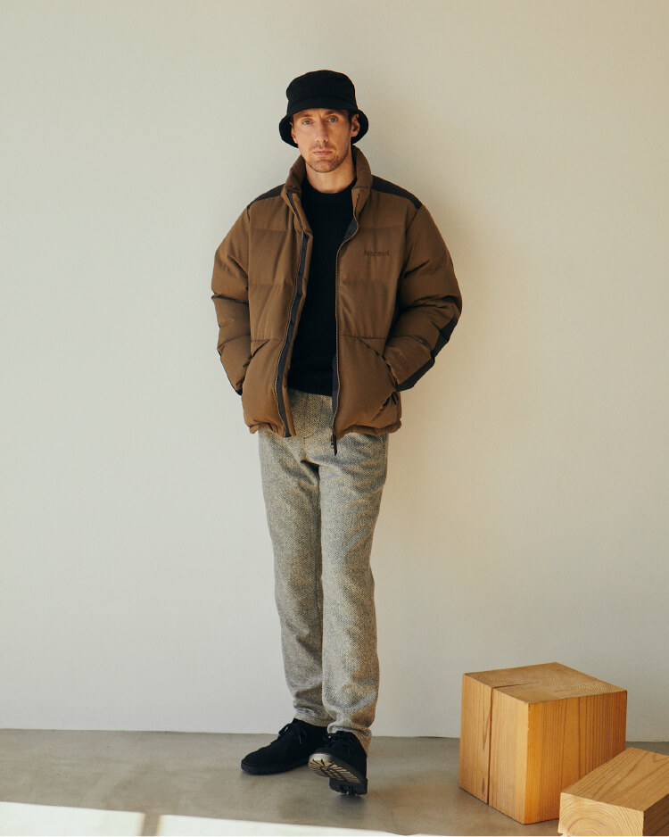 昨年に引き続きリリースするMarmotの別注ダウンジャケットは、90sの名作がベース。上品な着こなしにフィットできるようにフードは省略。スタンドカラーで仕立てました。今季的なブラウンは、あえて黒とのカラーパレットで。ウールのチノパンで上品に装うこともでき、休日アウターとしては無敵のハイスペックです。