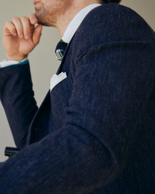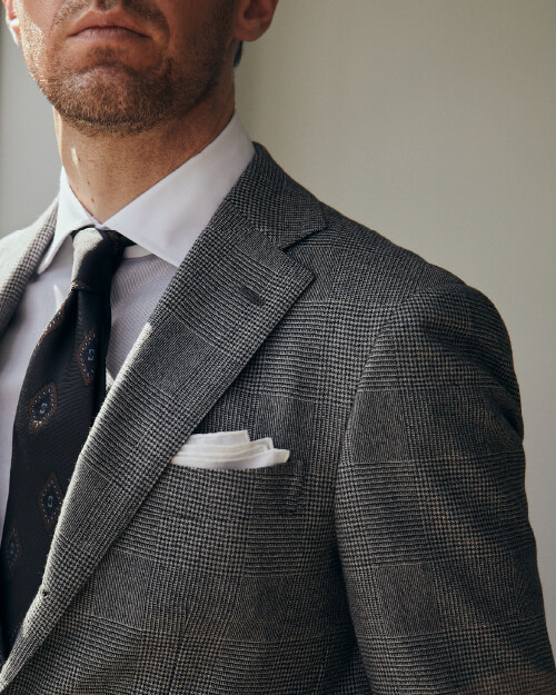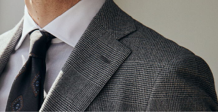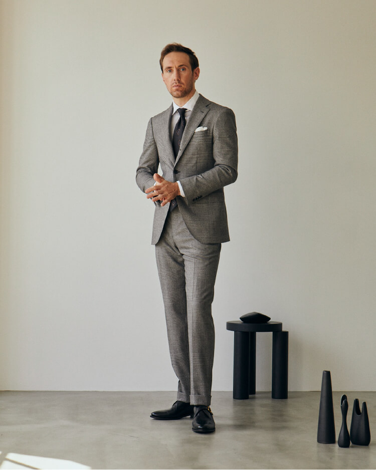 英国紳士の貫禄を演出したいなら、グレンチェックが正解です。ロロ・ピアーナ社の生地は目付けのある起毛ウールで、柔らかな着用感。美しいドレープを、大柄の格子が引き立てます。上質なスーツこそ、奇をてらわず格を大切に。紳士たるものしっかりチーフを挿し、どんなシーンにも相応しいスタイルを心がけて。