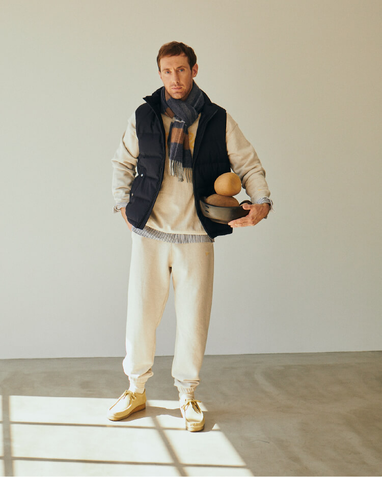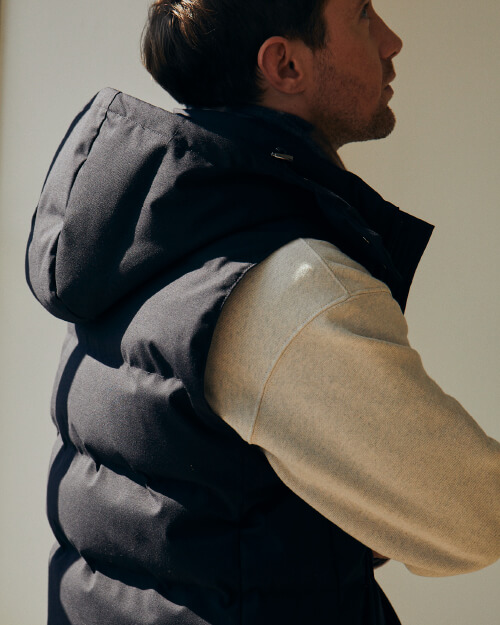 車移動が多い人にとって、ダウンベストはエッセンシャルでしょう。GOOSE DOWNの新作は、やや短めの着丈と、程よくすっきりとしたラインが特徴。上品なウールは質感もマットで、スウェットなどカジュアルな生地に重ねても落ち着いたルックス。フードはファスナーで着脱が可能で、取り外せばスマートなハイネックに。
