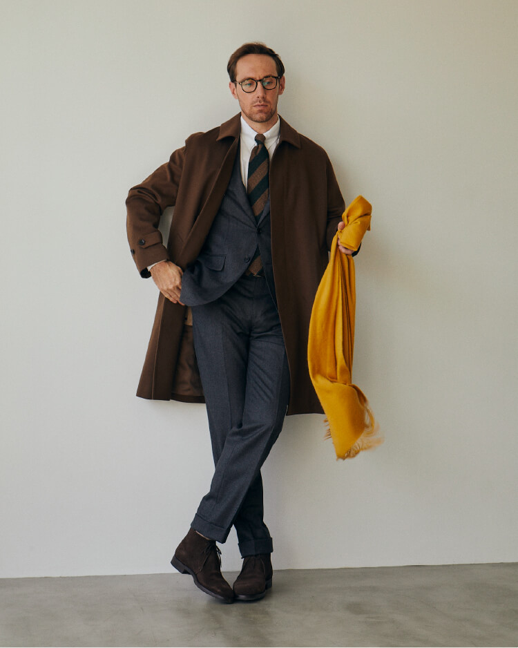 スタンダードなデザインとシルエットにこだわったステンカラーコート。ロロ・ピアーナ社のグリーンストームシステムは、天然の高級感とテクニカルな撥水、透湿、防風性を兼ね備えています。生地に限らず、比翼のディテールもスーツスタイルを格上げする要素のひとつ。タイの色をアウターで拾うのもテクニックです。