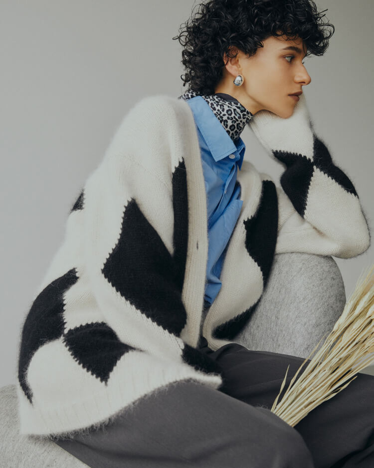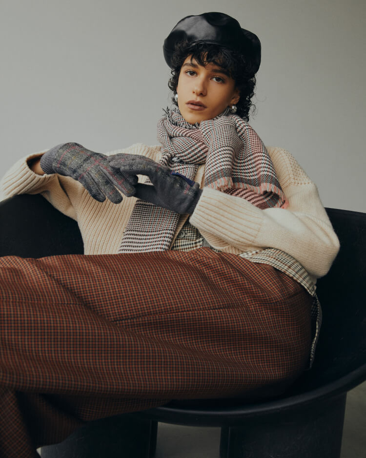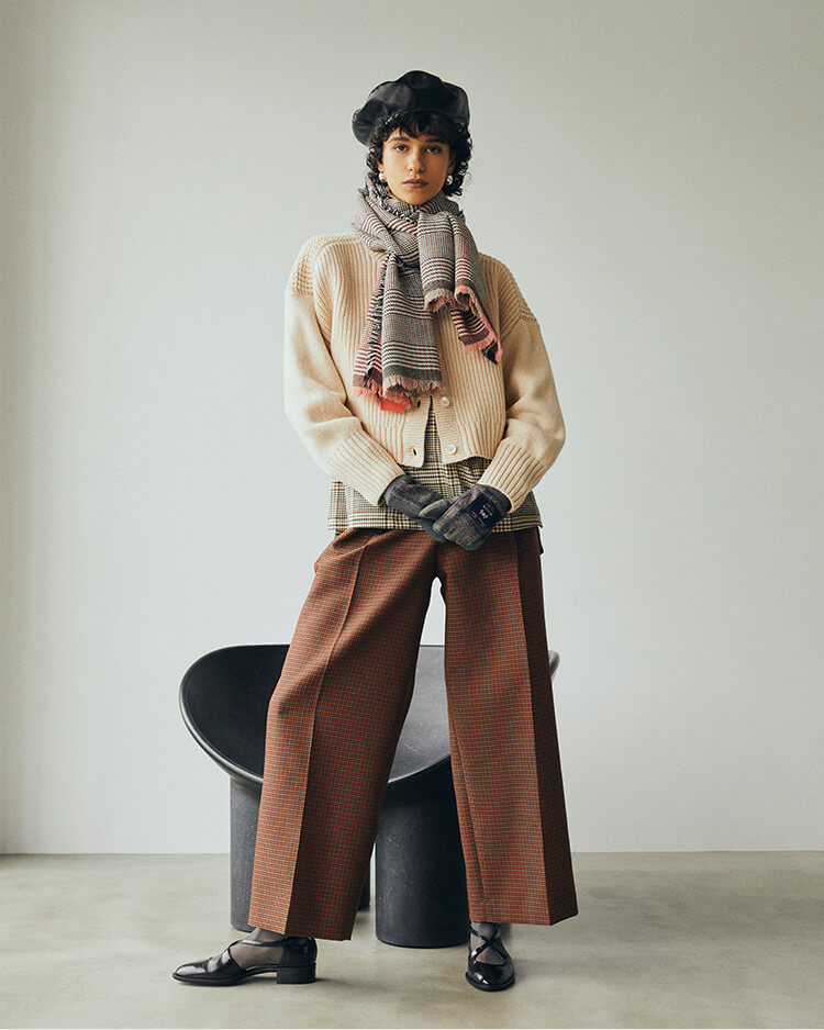 グレンチェック・タータンチェック・千鳥格子のパターンミックス。柄の細かさに強弱をつけつつ、短丈カーディガンを中和役に。ワイドパンツはセンタープレス&タック入りで、インでもアウトでもバランスよく見せてくれます。グローブや大ぶりのフェイクレザーのベレー帽など、小物でハンサムに仕上げるコツ。