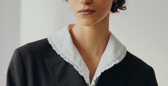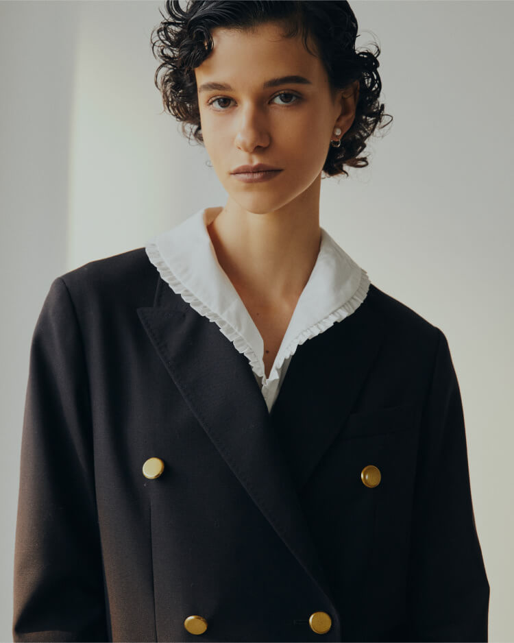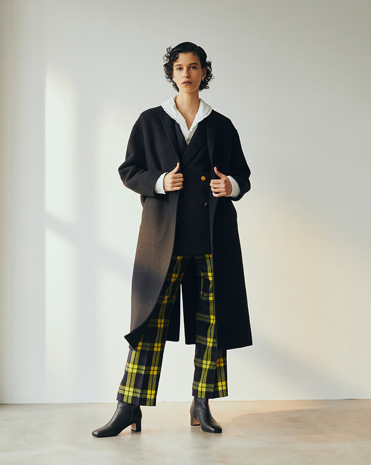 ダブルフェイスのウールチェスターコートは、ジャケットに重ねても窮屈さのない軽い着心地。金ボタンのダブルジャケットで王道のクラシカルさを追求しつつ、チェックパンツで味付けを。シャツではなくあえてブラウスを選ぶことで、大人のミックス感を楽しめるスタイリングに仕上がります。