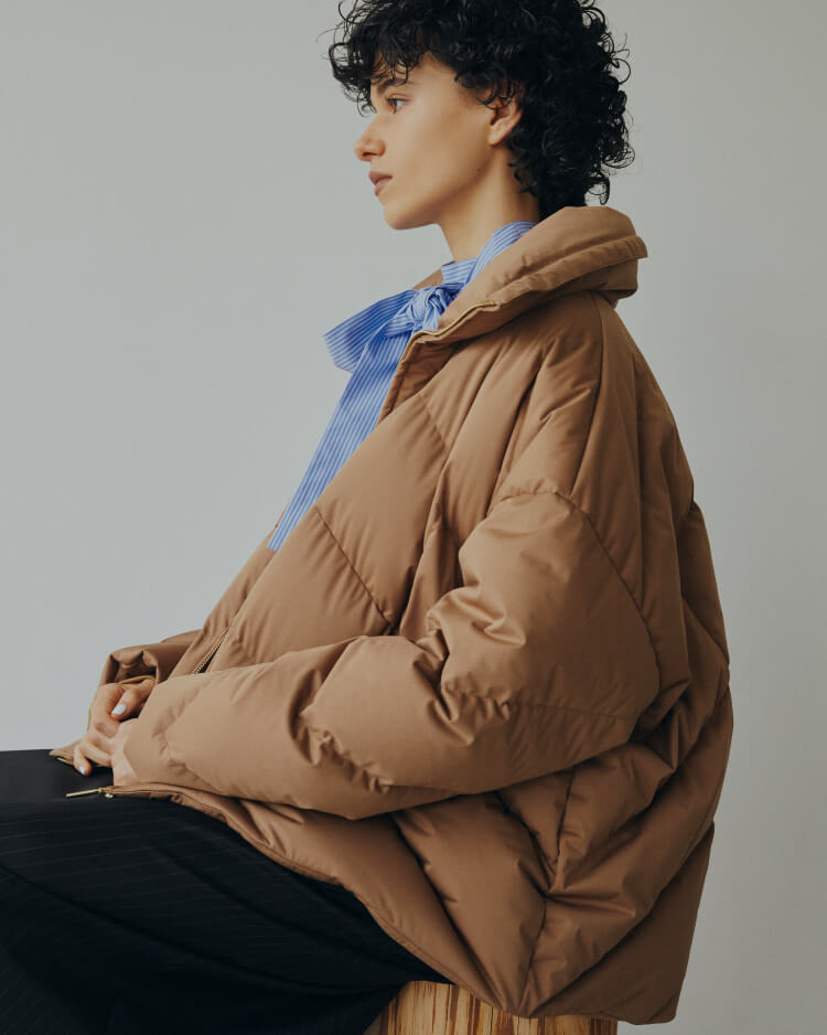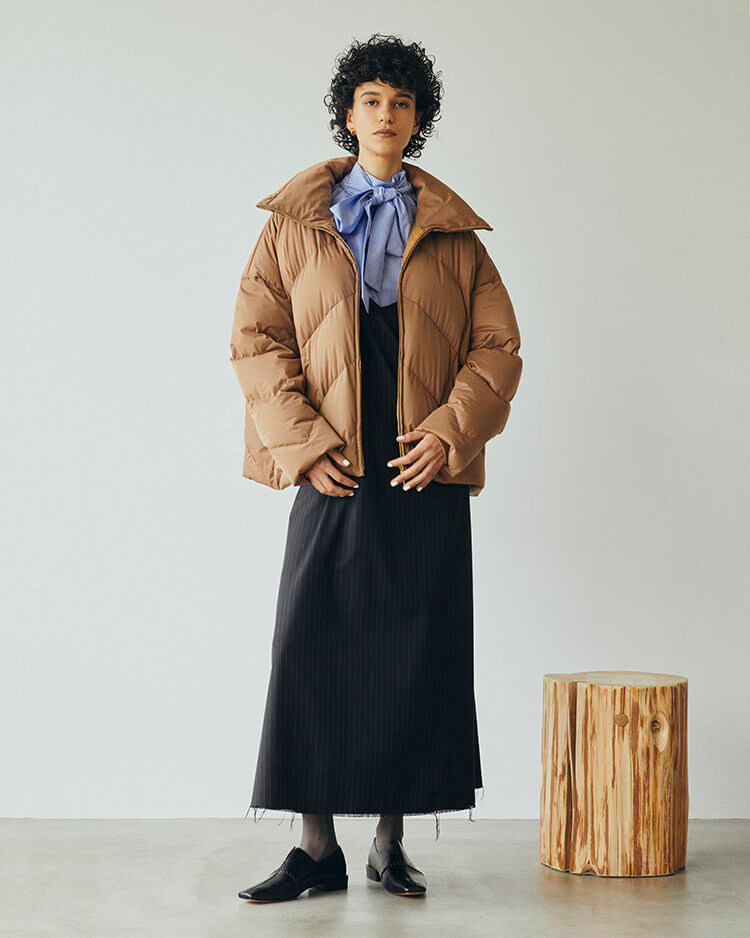 首元を彩る大きなボウタイが特徴的なブラウスにピンストライプのワンピースを合わせた、Iラインが際立つスタイル。アウターはボリューミィなコクーンシルエットで、全体のバランスに緩急をつけました。環境に配慮されたリサイクル素材のダウンは、パッカブルポケットに丸々収納できるのもうれしい。