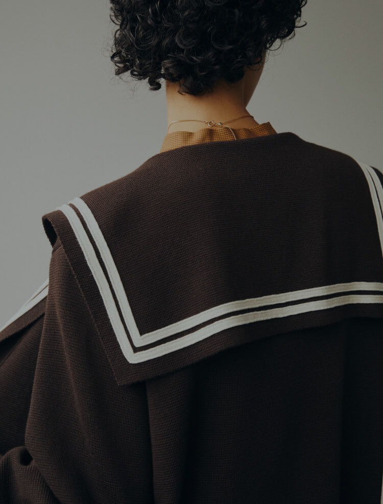 上質な素材とヴィンテージライクなセーラーカラー、ストンとしたボックスシルエットが魅力的なカーディガンが主役。大ぶりのラッフルブラウスで甘さをひと匙足しつつ、ブラン系のグラデーションで新鮮なマリンルックに。ボトムスはあえてウールのショートパンツとロングブーツで、バランスを更新して。