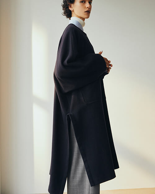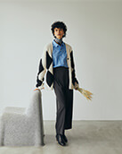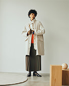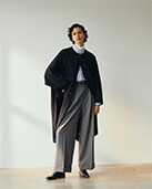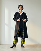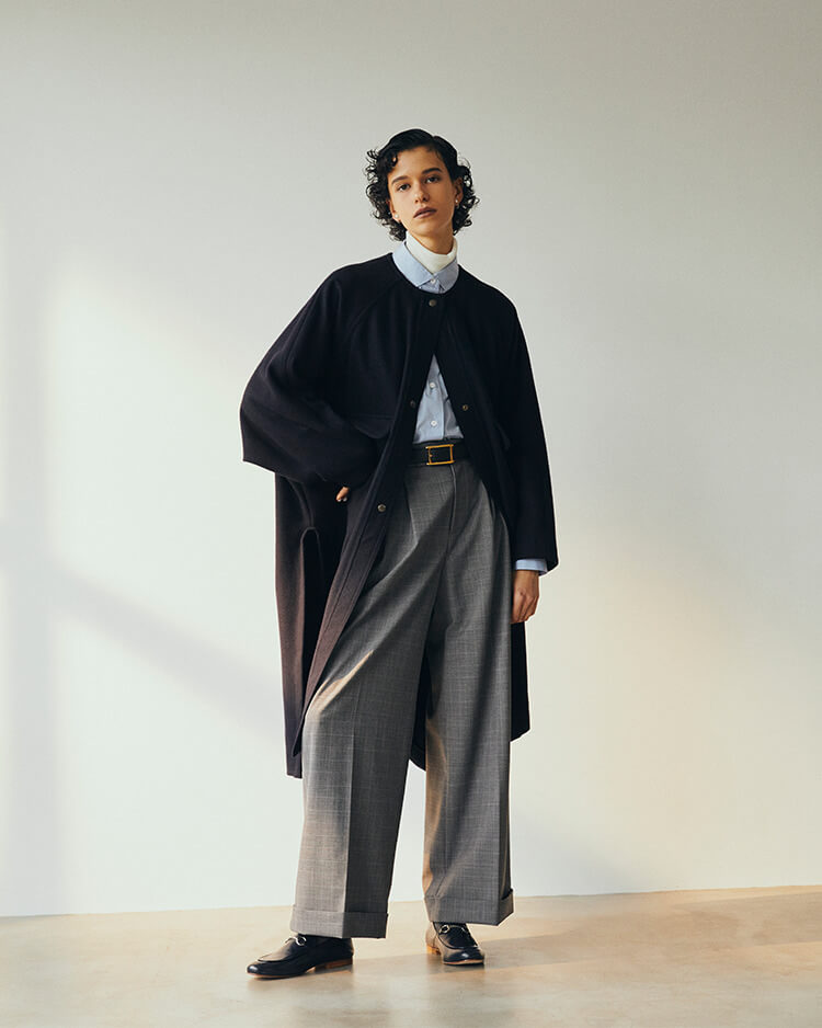 ノーカラーのアウターはそれだけでスタイルにまろやかさを加えてくれます。サイドには大きくスリットが入り、たっぷりとしたシルエットでインナーを選びません。身幅の大きなシャツをチェックのワイドパンツにインし、ベルトでしっかりウエストマークすることで、今年らしいスタイリングにアップデート。