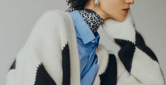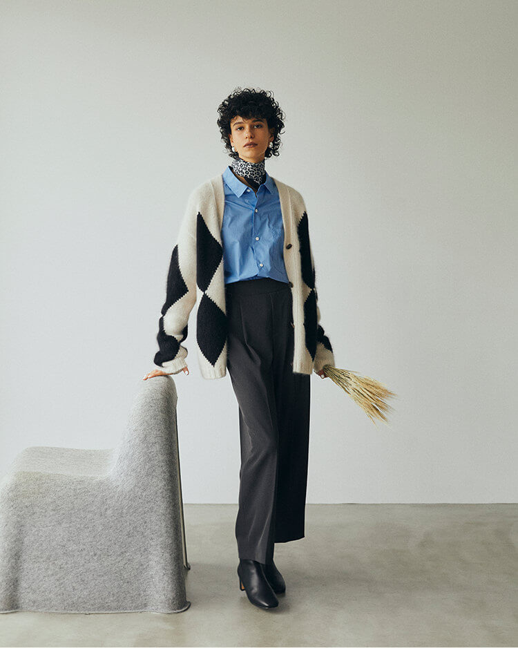 センタープレスのセミワイドパンツとブロードシャツのきちんとしたスタイルに、インパクトがあるアーガイル柄のカーディガンで遊びを足しました。パンツはストレッチが効いて動きやすいんです。ヒョウ柄のシルクスカーフや繊細なアクセサリーでマニッシュなコーディネートに華やかさをプラスして。