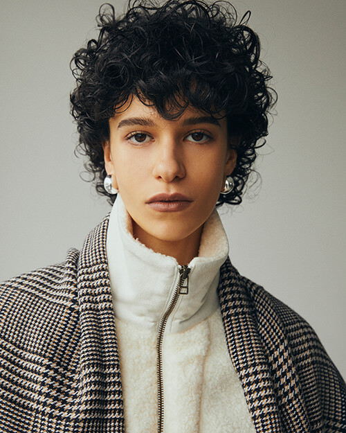 アウターにも重ねられるような、袖ぐりが大きく開いたボアベスト。カジュアルになりすぎないよう、ひとつひとつのループが細かいウール混素材で仕上げています。パッチワーク柄のワンピースやグレンチェックのストールでリズミカルな表情を加えて。ボーイッシュではなくドレッシーに仕上げるのが正解です。