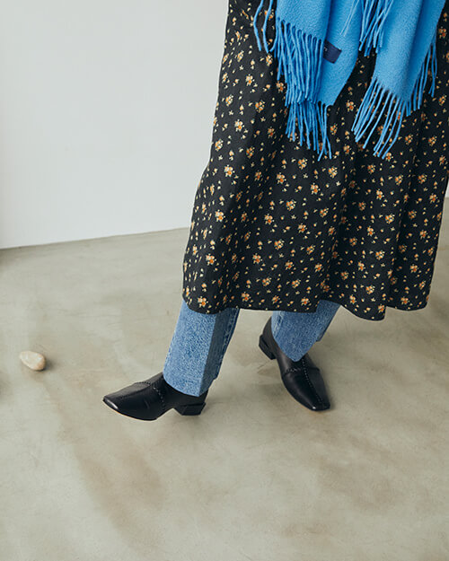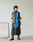 ストールをベルトマークすることで、まるでベスト同士を重ねているような印象的なスタイルに。ハイネックのタイトなインナーを仕込んで、メリハリを出しました。コンサバティブにならないように花柄ワンピースやデニムで楽しげに。黒とブルーの2色で仕上げることで、すっきりとした印象のレイヤードスタイルが完成。