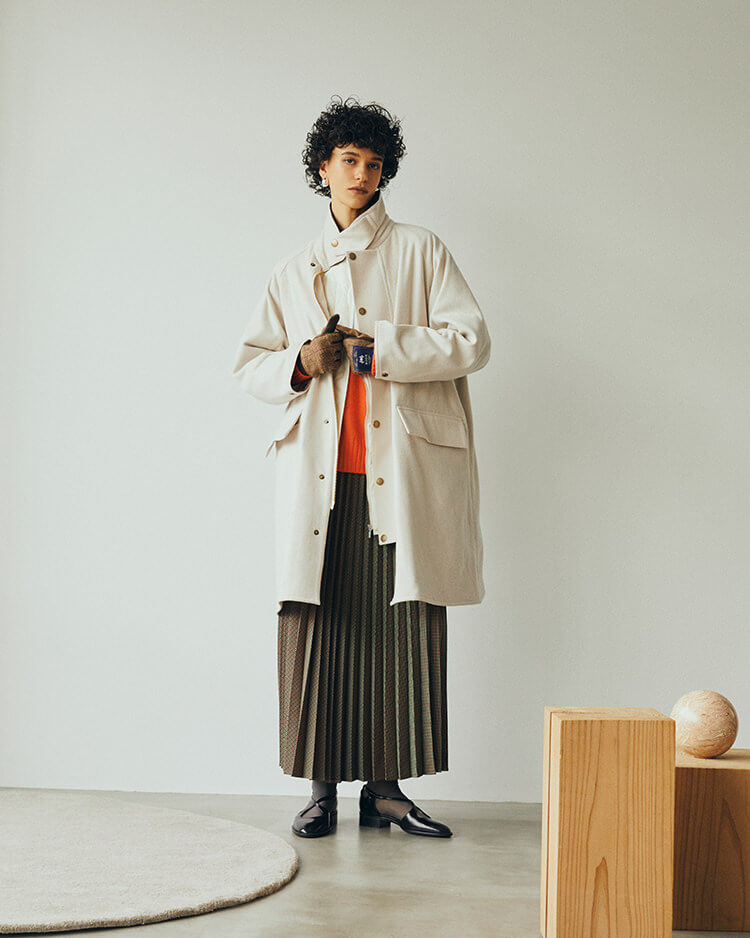 バブアーに別注したディスパッチコートは、毛足の短いウールベースの素材を採用し、あたたかい表情に。インナーには同色のキルティングと、目が覚めるようなビビッドオレンジのウールカシミアニットを合わせてメリハリを出しました。クラシカルなチェックのプリーツスカートでフェミニンさを足して。