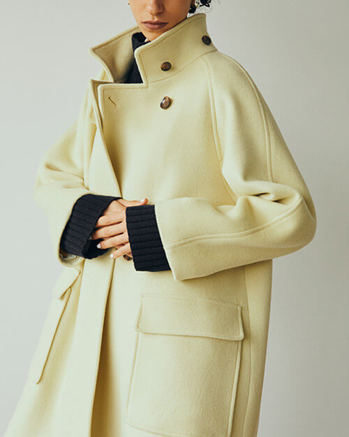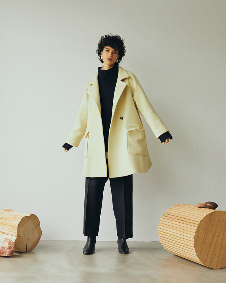 コートは程よくカジュアルにも着られるミドル丈で、チンストラップを留めてスタンドカラーにもボタンをあけてチェスターコートのようにもなる2WAY仕様。 スモーキーなパステルイエローと、締め色ブラックのコントラストが強くなりすぎないように、中に白シャツを忍ばせて。メンズブランドのトラウザーを選んでタフな装いに。