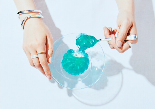 ふわふわとシャリシャリが同時に押し寄せる口福の味、レモンケーキ。異なるものの組み合わせは常に私たちの心をくすぐります。シルバーとゴールドを掛け合わせたブレスレットや、ビジューを配色であしらったハートのリングで気分を盛り上げたい!