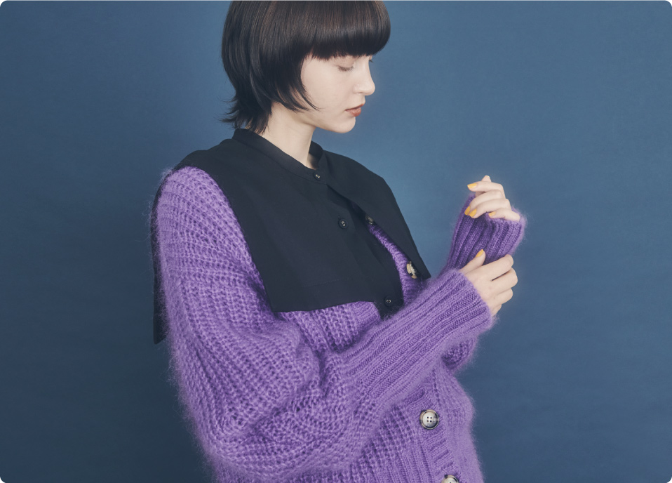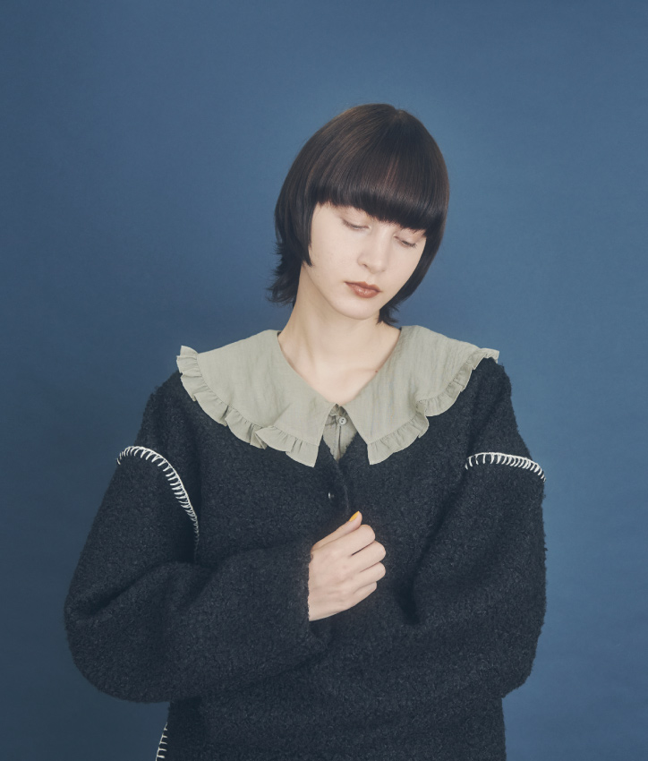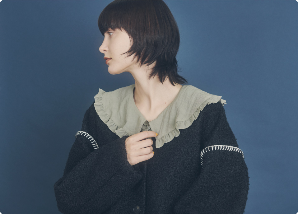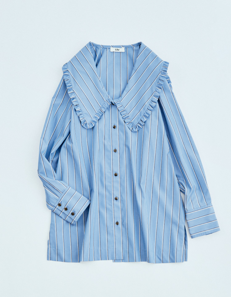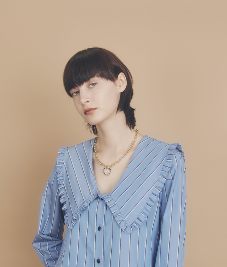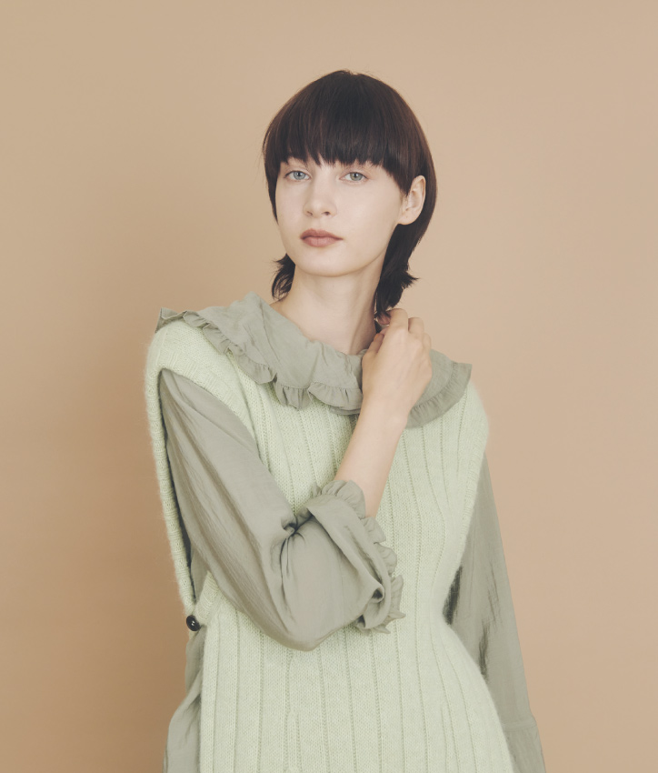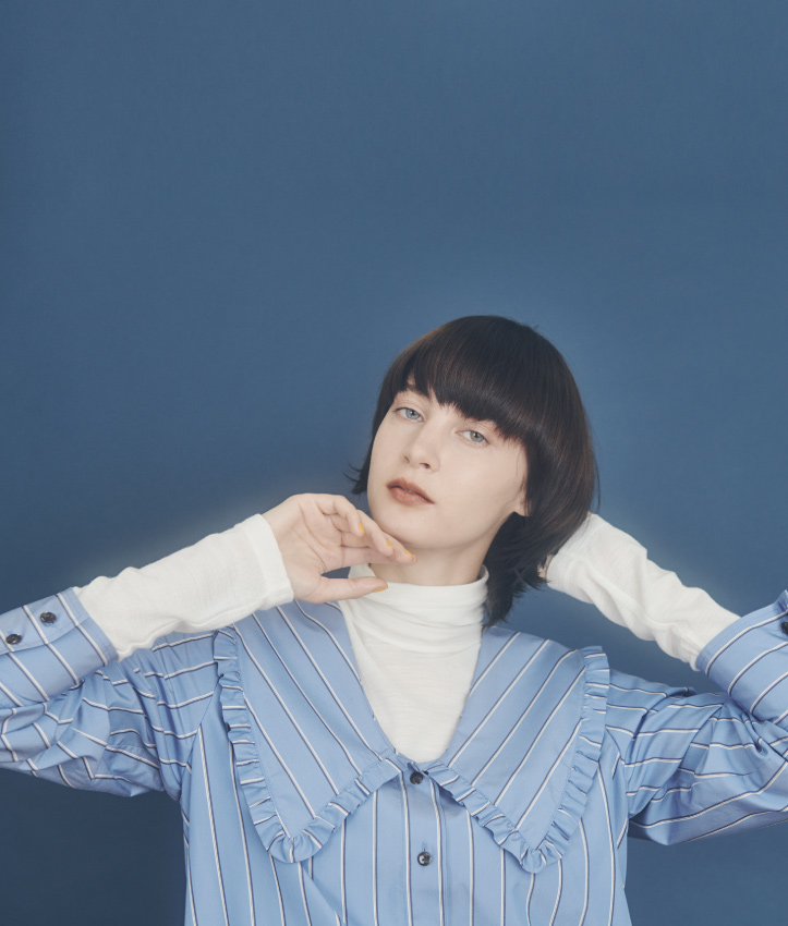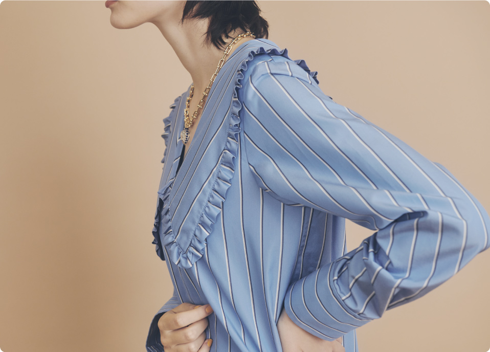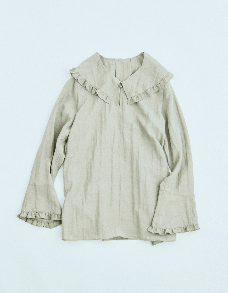 落ち感や少し透けるニュアンスが楽しめる生地は、インポートならではの風合いが魅力。袖と襟にフリルをあしらいフェミニンさを出しつつも、ボタンを外せばスキッパーシャツのように着られて、様々な表情が楽しめます。