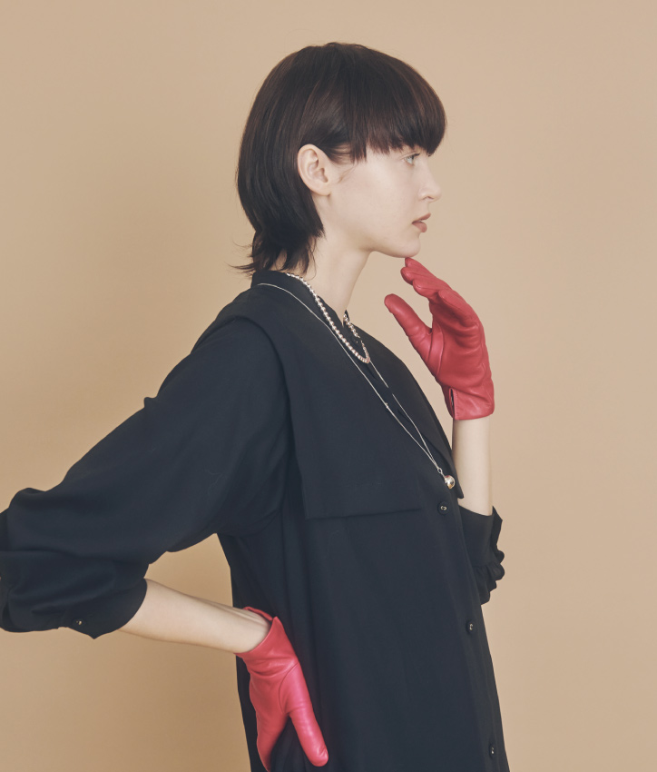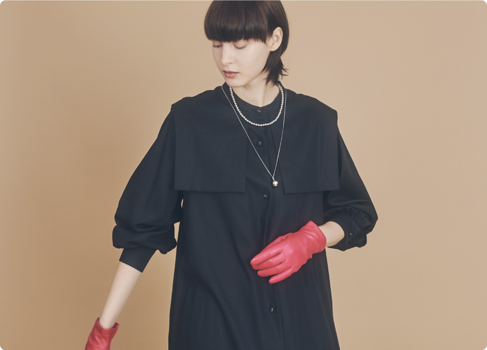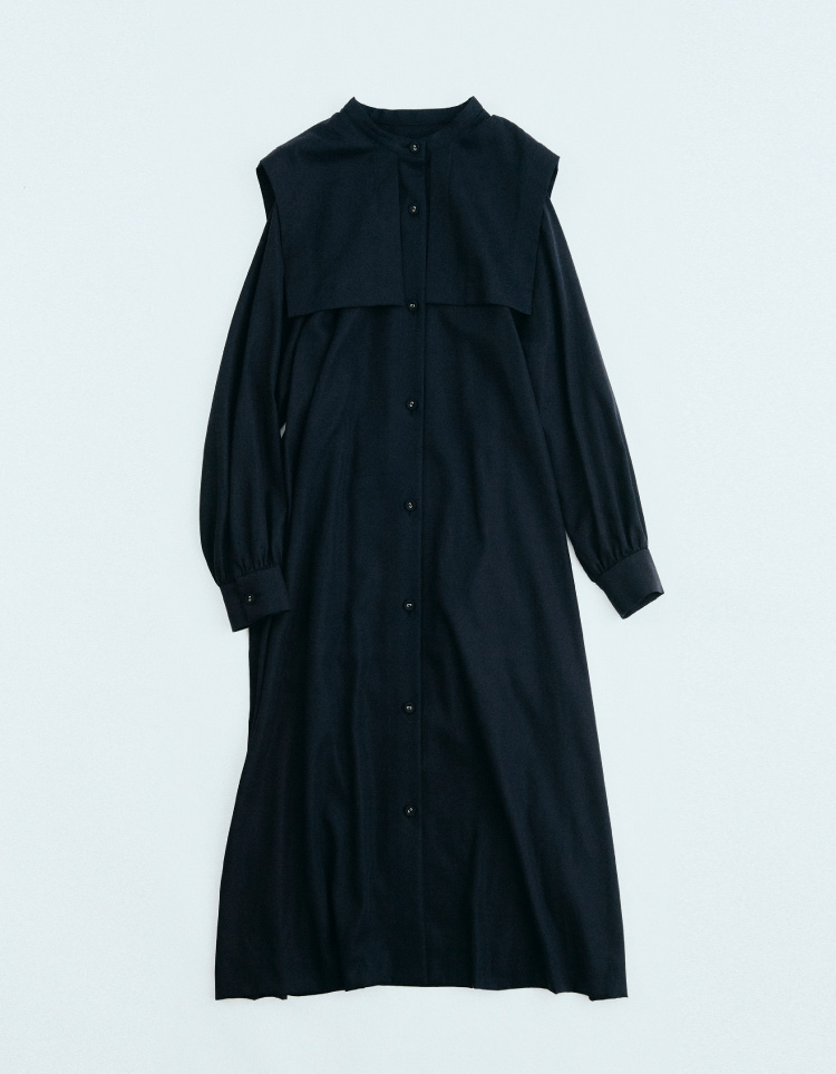 バンドカラーのシャツワンピースは、まるでローブのような前に長く垂れた襟が特徴的。バックはセーラーカラーになっているので後ろ姿もキマるんです。これ1枚でこなれて見せてくれる便利さが◎。