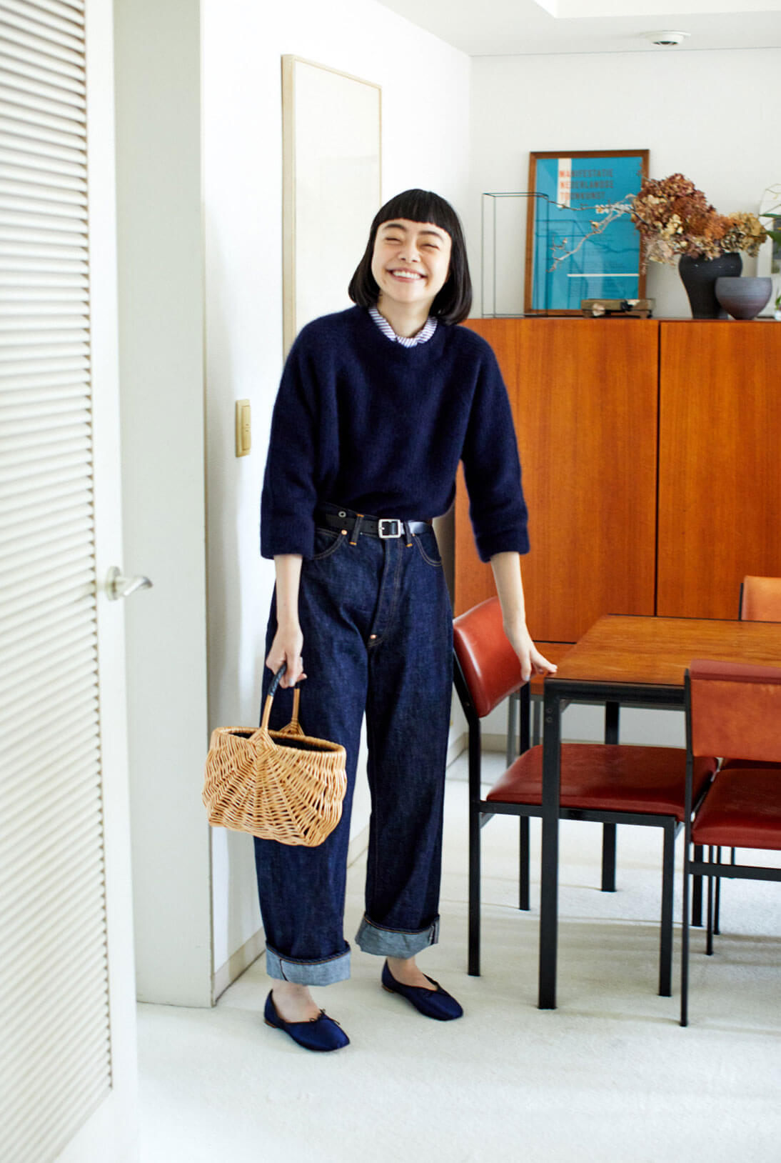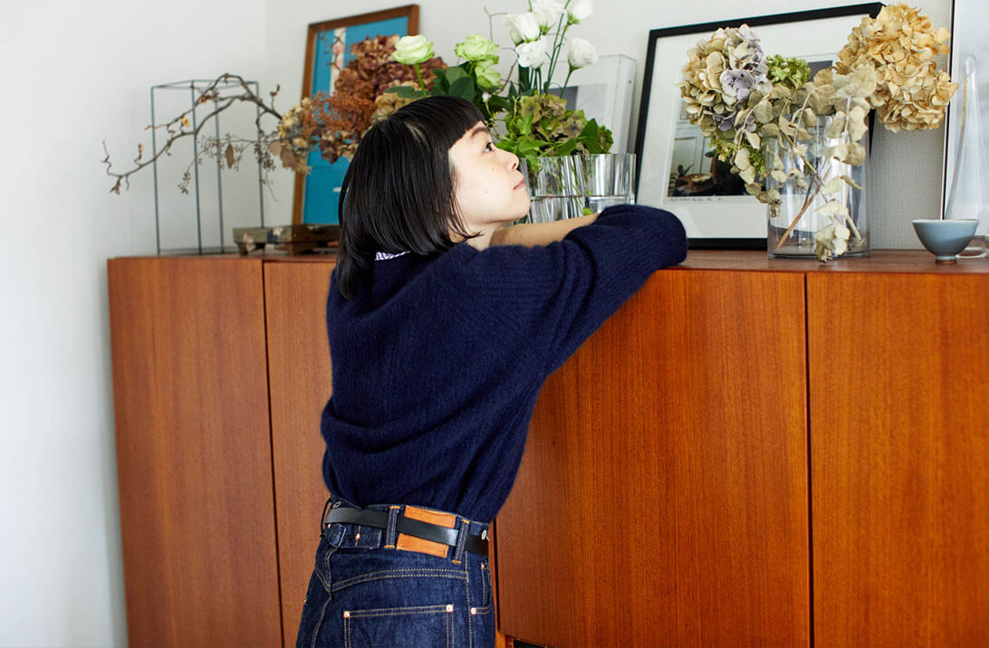 そして、今回は私物のベルトでウエストマーク。「ゆったりめのデニムにトップスをインして、ハイウエストでキュッとまとめるスタイルが大好きなんです! 脚を長く見せたいからかも(笑)」形とハリ感がすっかり気に入ったという、このデニム。着用した瞬間から「ほし〜い!」と目を輝かせるKanocoさんなのでした。