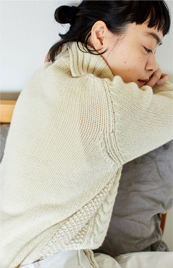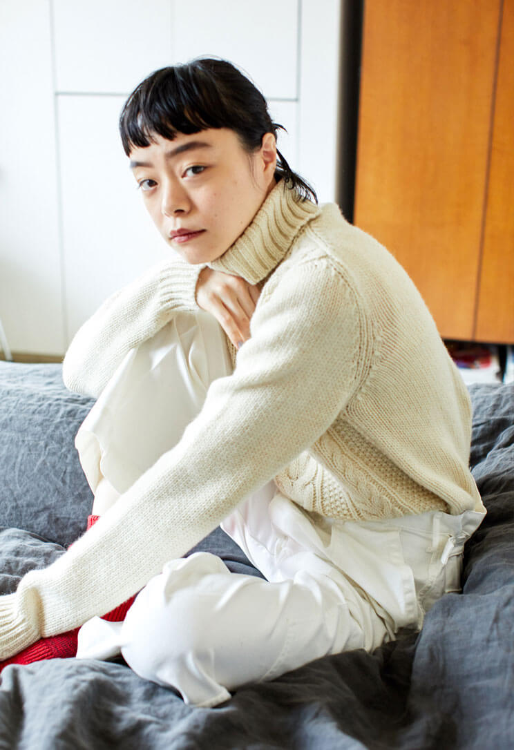 「実は、首にはちょっとしたコンプレックスがあって」という意外な告白も。「短いんですよ、うちの家系(笑)。家族写真を撮るときは、みんなで“肩をなるべく落として! 首を伸ばして!”って大騒ぎ! でも、このタートルネックは後ろにスリットが入っていて着やすいですし、ほどよい高さでしっかり私の首を長く見せてくれました」