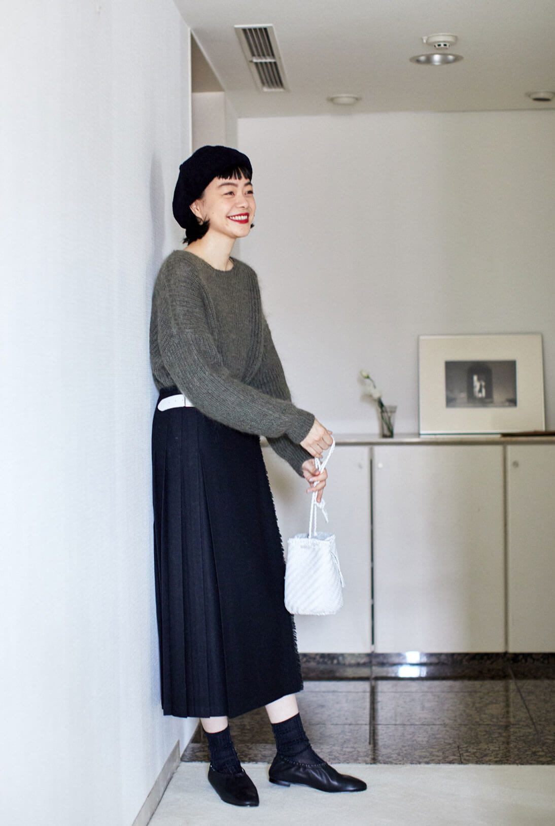 - もともとモード系の服装が好きだったというKanocoさんは、黒、白、ネイビーがお気に入りの色。「その3色は、絶対に変わらないと思っていたんですが、最近カーキも急上昇中なんです!」カーキはミリタリーのイメージが強く、カジュアルテイストになりそうで最近までなかなか手が伸びなかったそう。「でもモノトーンと合わせると、実は女性らしく着こなせる色だって気づいたんです!」