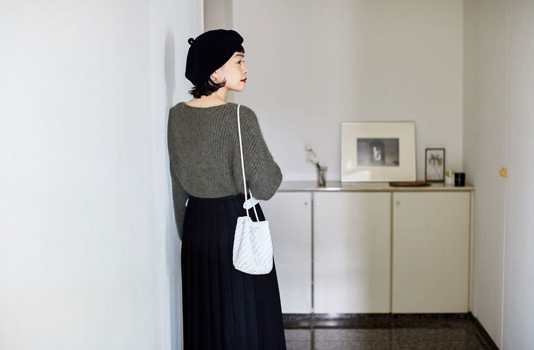 「きっと前ならきっとシンプルな白シャツを選んでいましたが、今回はリボンタイブラウスにして首元を遊び心をのぞかせてみました。冬のカゴバッグも最近目覚めたばかり。自然の中にいるみたいでカワイイですよね」