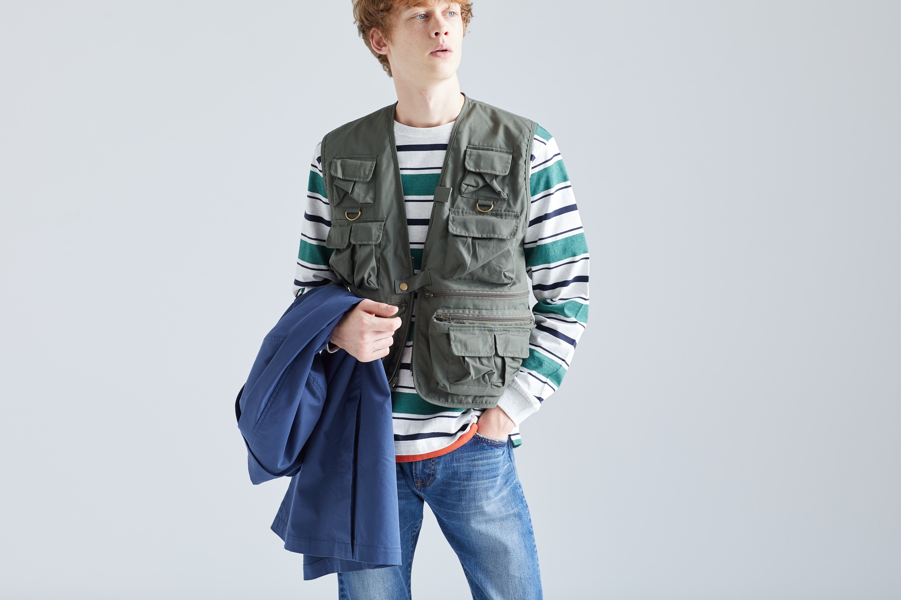 おしゃれに着こなしている女の子を街で見かけて、ついに買ったフィッシングベスト。でも、意外にコーディネートが難しい・・・。アクの強いアイテムだけに、中途半端に取り入れると野暮ったくなってしまう。そこで、マルチボーダーのロングスリーブTシャツの上に羽織り、全体をブルーの中間色でまとめてみたら驚くほどにフィットした。きれい目なステンカラーコートから、チラリと見えるさりげない感じも気に入っている。