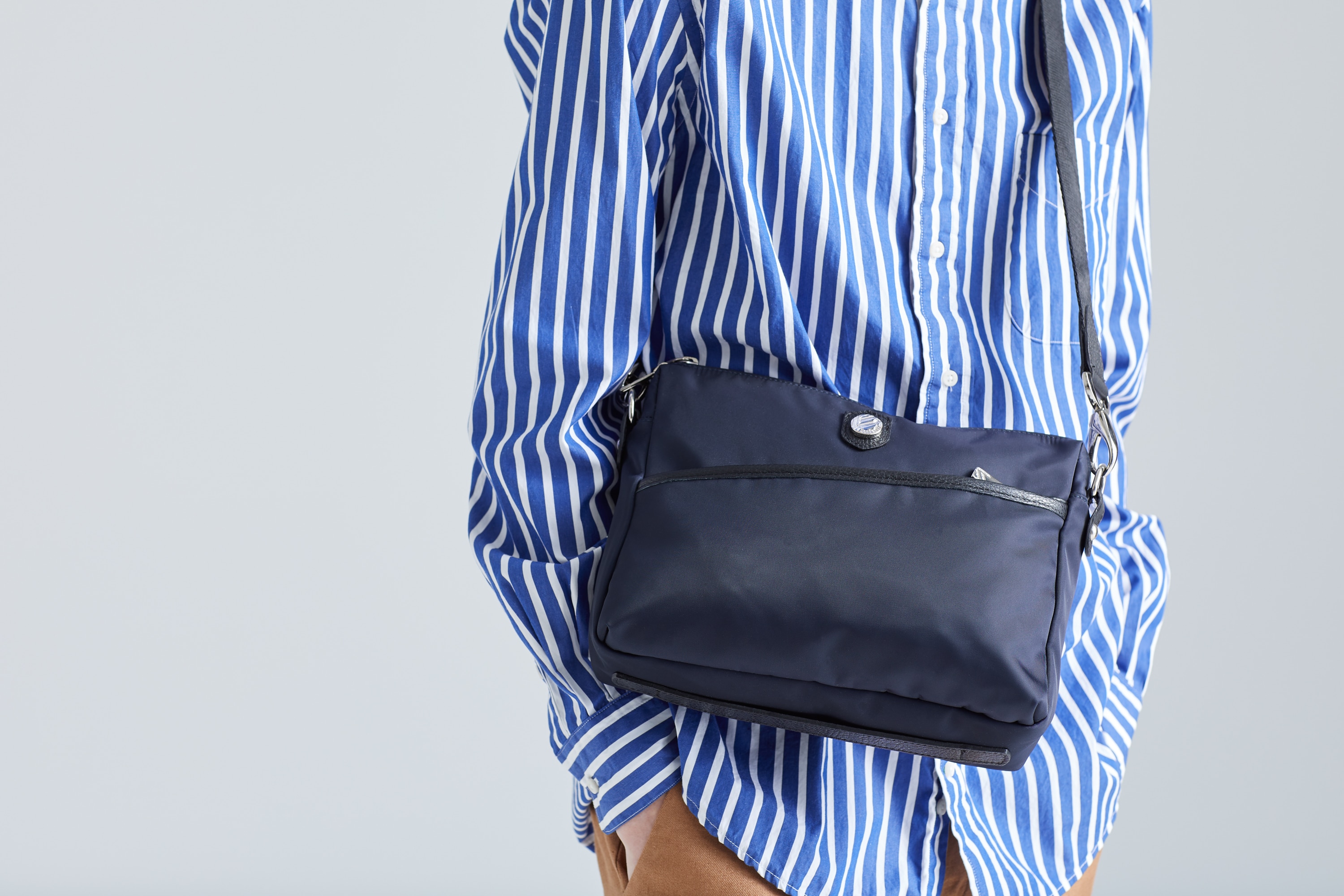 最近は月イチで開催されるようになった、オーガニック系の食材が集まるマーケット。人気になってからは雑貨なんかも増えて、週末の楽しみになった。今日のお目当ては、冬はホットで、夏は炭酸割りでと、いろいろ使えるジンジャーシロップ。温かくなってきたから、バンドカラーシャツ一枚で行けるのが嬉しい。トレンドのストライプシャツに合わせたボトムは、リネン素材のイージーパンツで初夏を先取り。そして、コーデの仕上げに使い勝手のよいナイロン素材のショルダーバッグをチョイス。