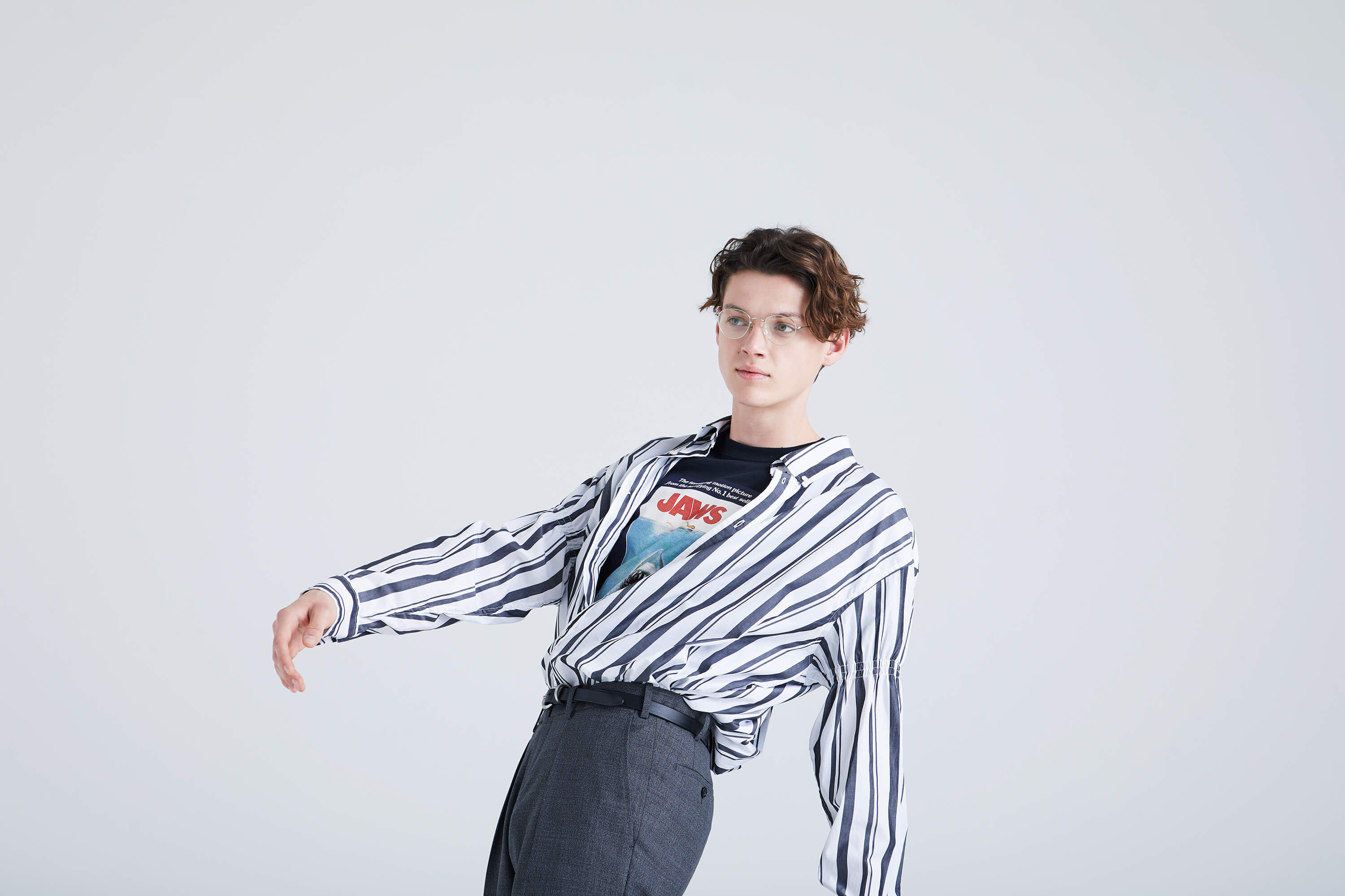 先日、取引先の担当者と映画の話で盛り上がったばかり。おすすめされた『ジョーズ』をAmazonプライムビデオでチェック。そんなタイミングで偶然に見つけたがこのTシャツ。早速、ビッグシルエットのストライプシャツの下に仕込んで打ち合わせへ。このシャツも二の腕にギャザーが入っていたりと個性的でお気に入り。それを生かすように、スラックスにインして膨らみのあるシルエットを出してみた。僕の演出にすぐ気づいてくれて商談もいい感じに進行。話が合う人との仕事は楽しい。
