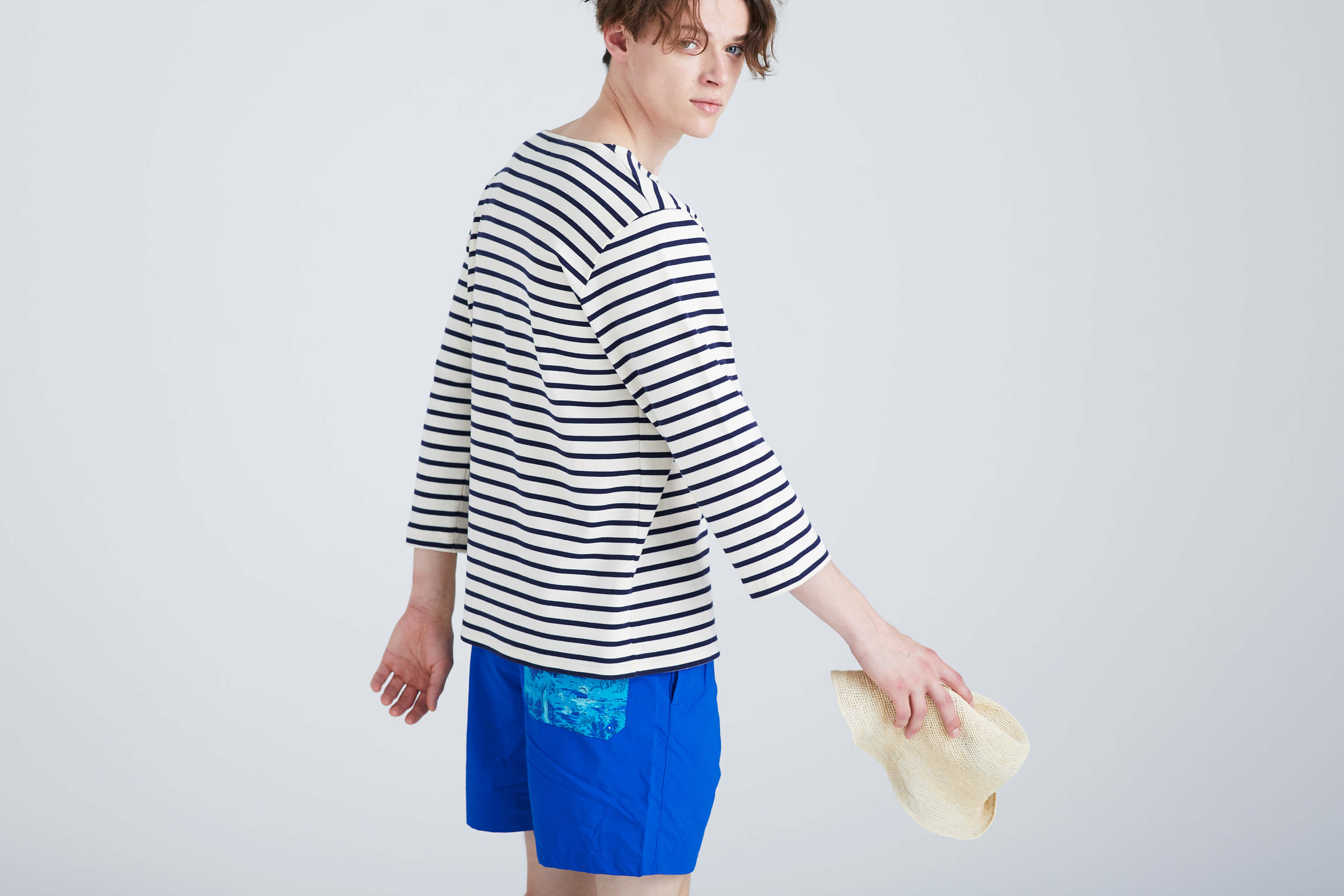 夏の予定を早く決めてほしいという彼女の要望で、南伊豆は弓ヶ浜への2泊3日が決定。ここは湾曲した全長1.2kmのロングビーチがポイント。下田駅から少し距離があることもあって、穏やかでプライベートビーチのような雰囲気がお気に入り。家族連れも多くてのんびりしているのもいい。そんなときはリゾート気分で「マリン」なスタイルで過ごしたい。コロンビアのビーチショーツに、マリンボーダーのバスクシャツを無造作に合わせて、パナマハットをプラス。あとはのんびり過ごすだけ。