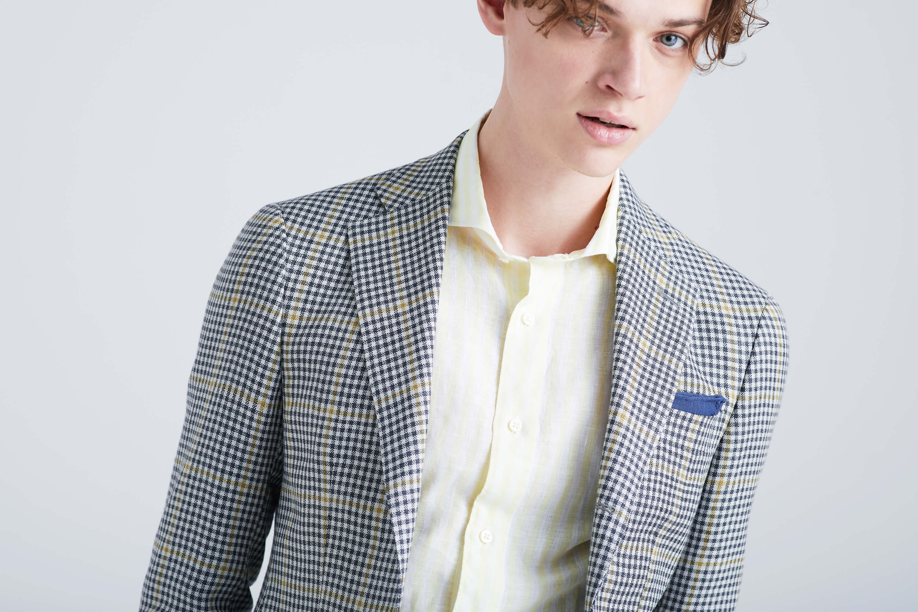 地元の幼馴染から届いた一通の手紙。封筒を開けると、海沿いでおこなわれるリゾートウエディングの招待だった。さすが、昔からおしゃれな友人だっただけある。真っ先に浮かんだのは「何を着て行こう?」ということ。選んだのはウィンドウペーン柄のジャケット。柄のイエローをひろい、レモンイエローのストライプリネンシャツをチョイス。リネン素材はドライタッチで、初夏の風を心地良く通してくれる。仕上げは夏の海に映える真っ白なリネンパンツで。あとは素足にスエードローファーでスタイリングはバッチリ。