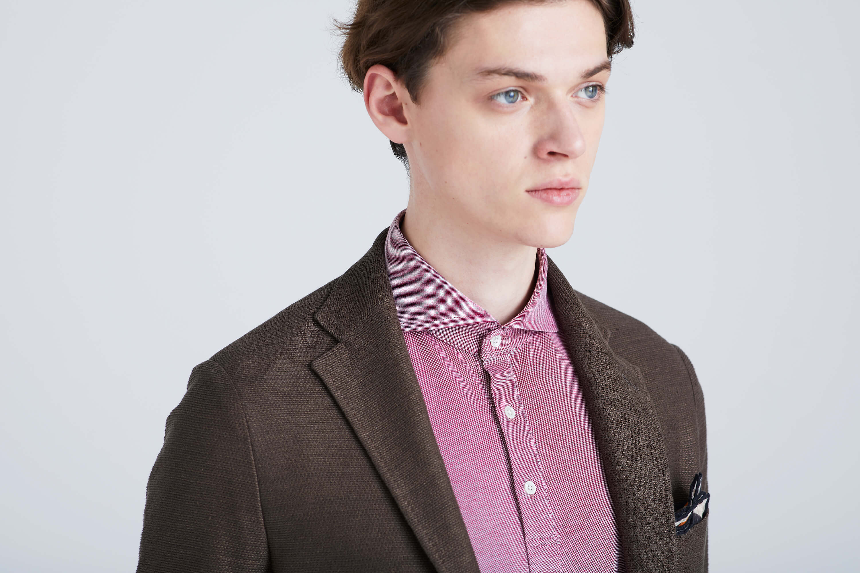 今日は撮影の立会い。クライアントと駅前で待ち合わせをして、タクシーで湾岸エリアのスタジオへ。リネン素材のジャージージャケットは伸縮性があって動きやすく、やや濃いめのブラウンはエレガントな雰囲気を与えてくれる。つまり、ヘビロテなアイテム。そこにロゼオカラーのポロシャツで程よい色気をプラス。パンツもウォッシャブル対応のトロピカルウールだから汗をかいても問題なし。撮影が長引いても、これなら一日中快適。