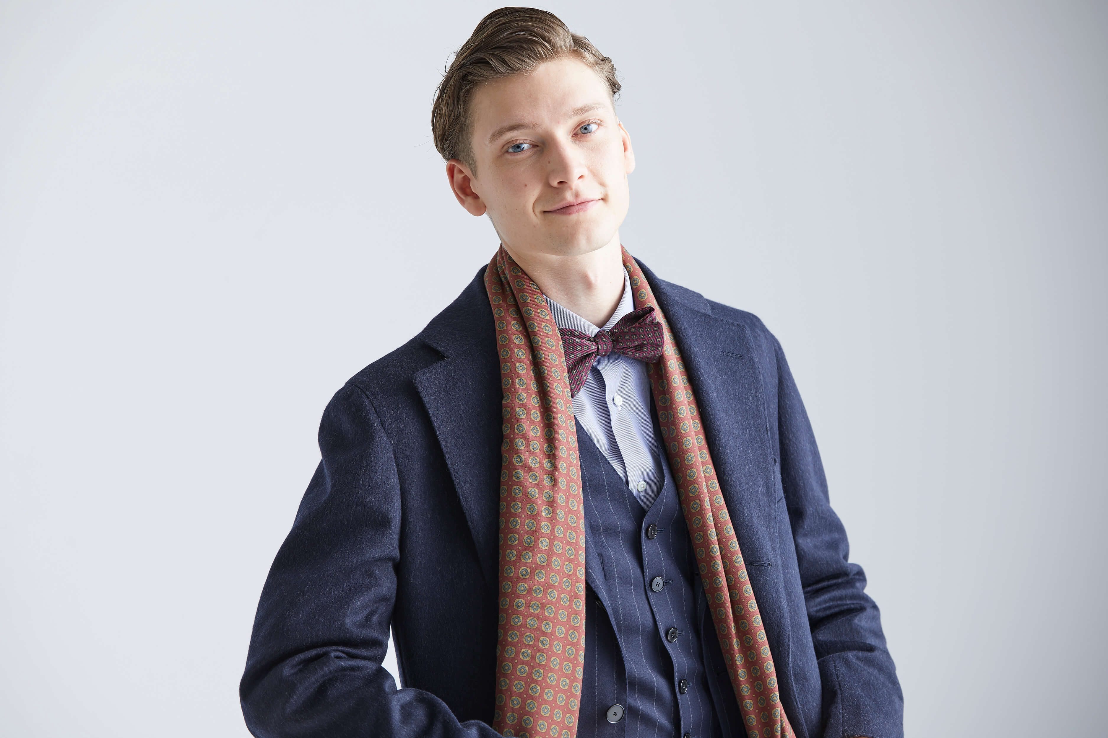 大学時代の仲間が、またひとり結婚することになった。そんなおめでたい席の2次会は、パーティ感を強めたくてボウタイで行くことにした。でも、本当のお気に入りはカシミヤ混のライトウエイトなチェスターコート。着丈が長めだからどんなスーツにもフィットするし、何より素材感が最高で軽くて柔らかい。さらに、3Pスーツはチョークストライプ柄のフランネル素材にして、全体的に冬のウォーム感を演出してみた。これで独身は僕ひとりになるけれど、プレッシャーもないし今は人生を楽しんでいるところ。